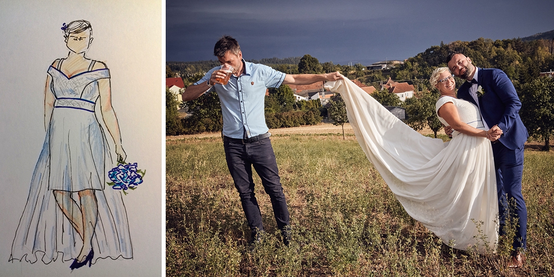 Původní představa nevěsty byl vršek se spadlými rameny a la svatební model Jackie Kennedy, ovšem s lehčí, rozevlátou sukní a předním rozparkem. To jsem dodržela s drobnou úpravou: s ohledem na plnější výstřih budoucí nositelky jsem doporučila jsem přidat k živůtku podpůrná ramínka, která rovněž zakrývají ramínka podprsenky.