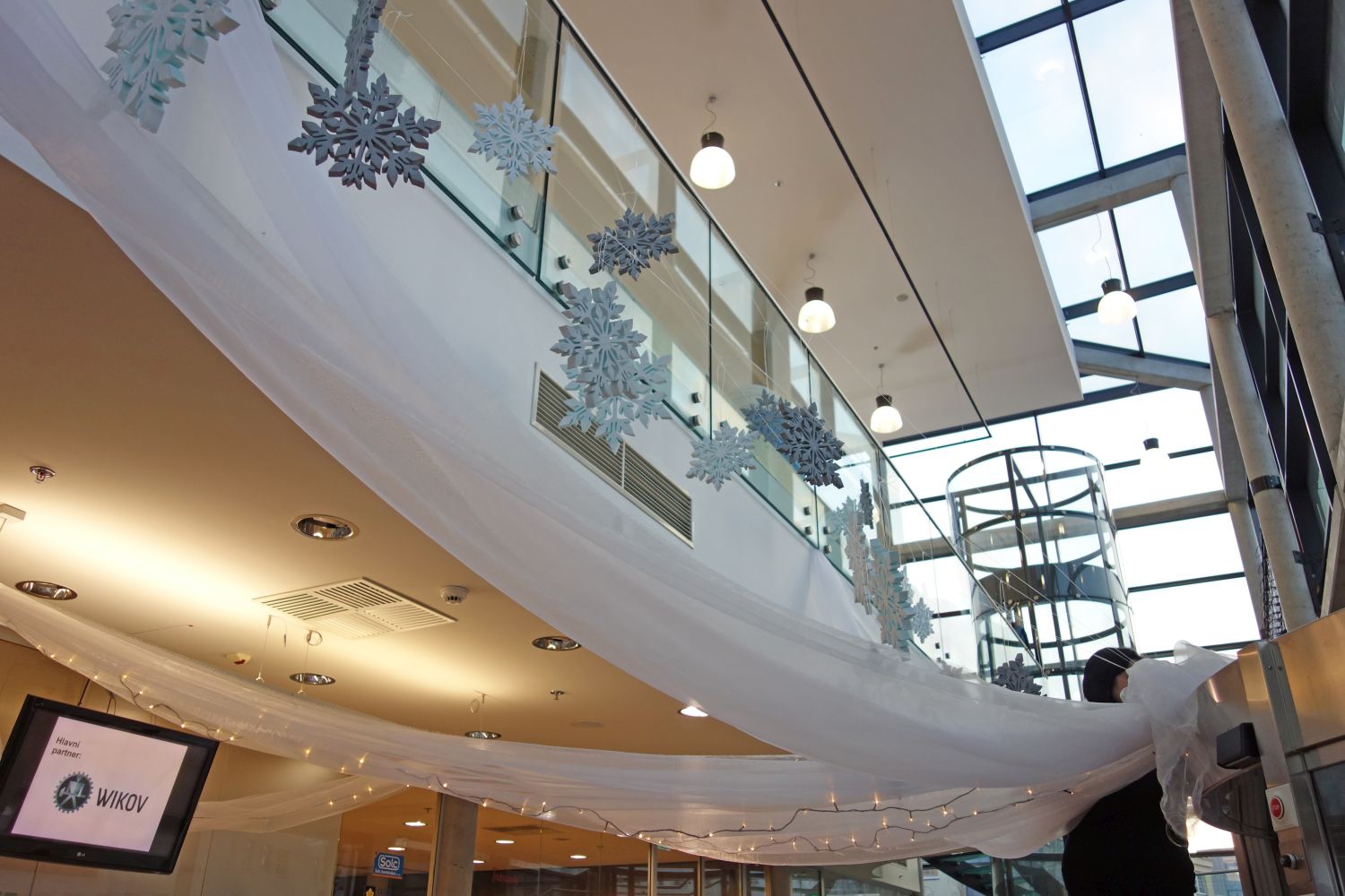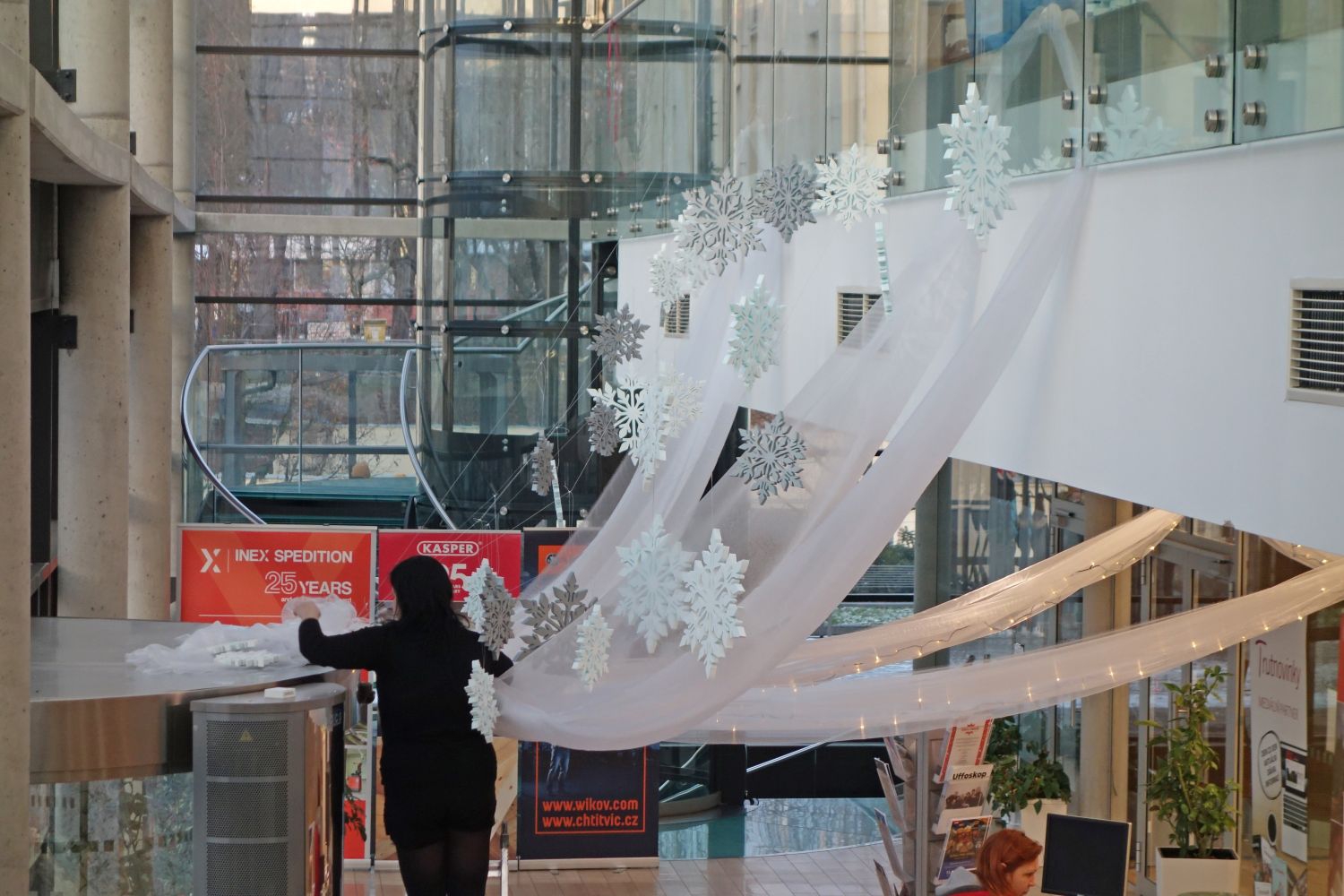 Alča vytvořila základní koncepci a kluci z Humlnet Creative vyřezali vločky a andělíčky. Pak už jen "zbývalo" to všechno přímo na místě doladit a dát tomu finální fazónku...a nastříhat, uvázat, rozvěsit, načechrat... Velké díky patří také paní recepční za trpělivost s naším Pat&Mat style.